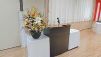 式場準備中に生花が届き、華やかな雰囲気になってきました。